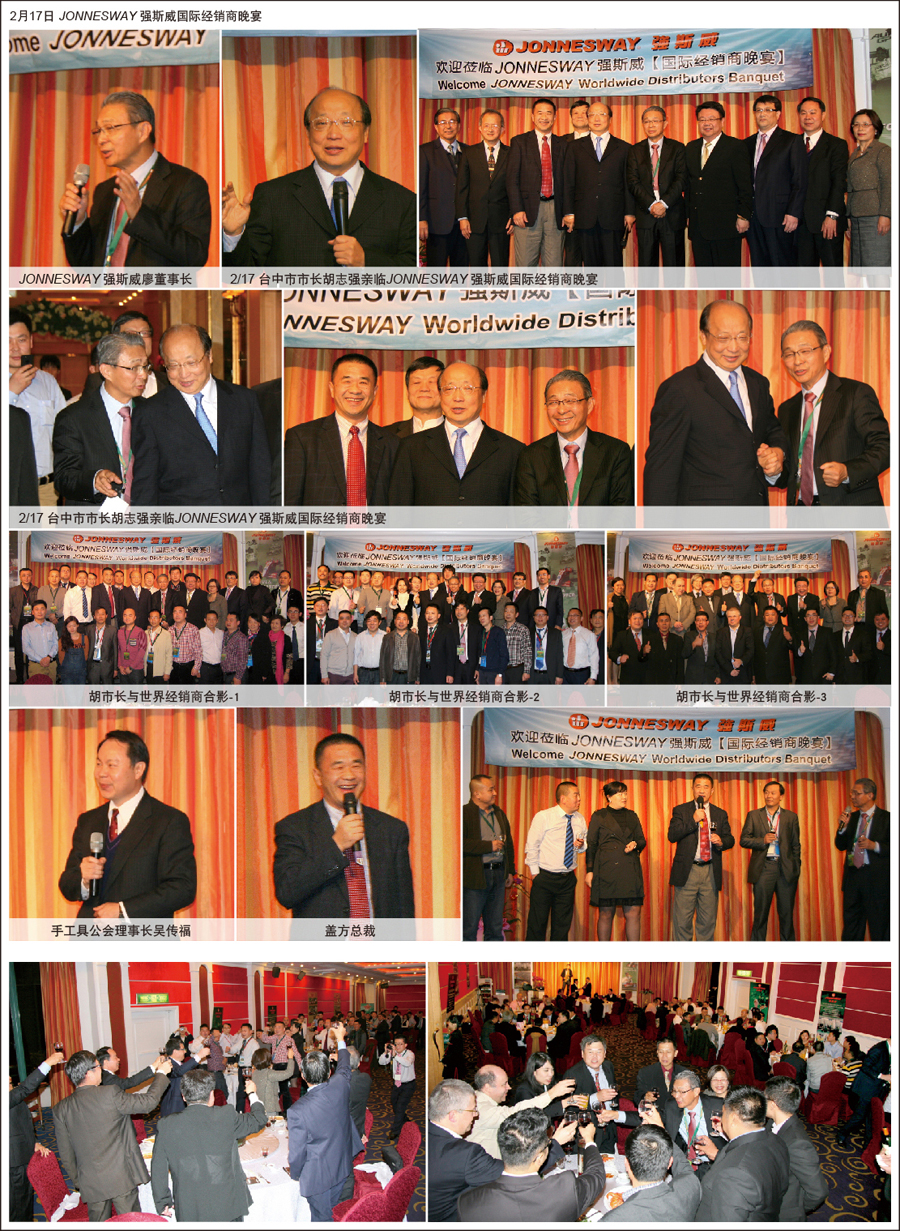 JONNESWAY 强斯威2月17日在台中举办的国际经销商晚宴,有近百位来自产官学各界人士共赴盛会─台中市长胡志强莅临现场为晚会加值,手工具工会吴理事长站台肯定支持!更有台中市经济发展局王局长、手工具公会吴理事长、中兴大学陆教授、东海大学前管理学院院长林教授皆热情参与晚宴,让所有与会者皆感到备受尊宠,万分欣喜! |