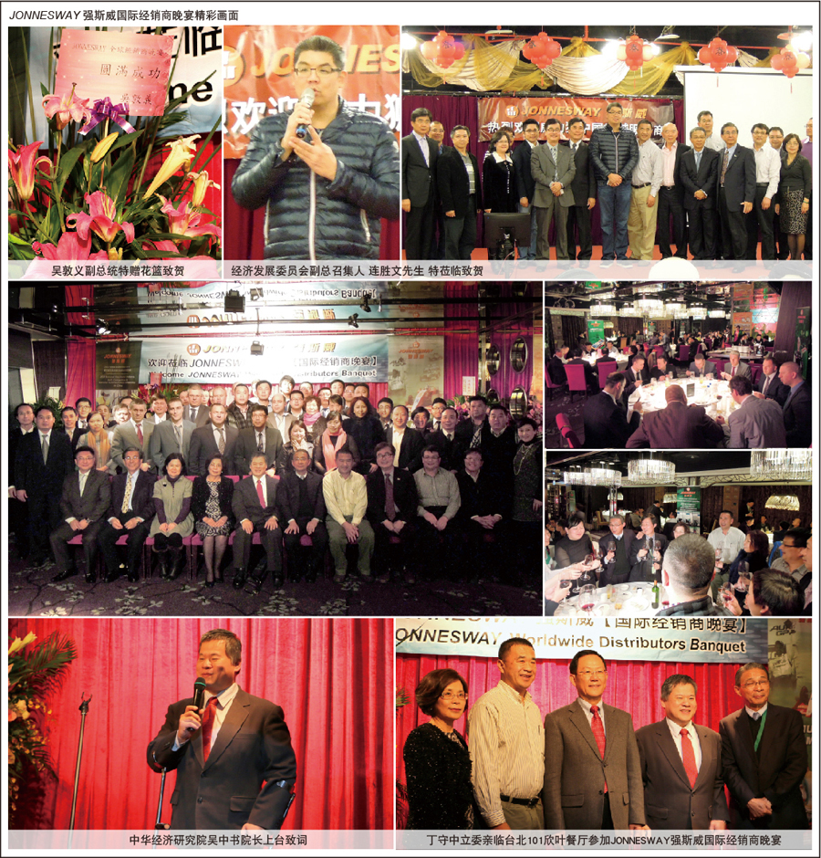2月19日在台北101举办第二场国际经销商晚宴,丁守中立委、马吴民间之友会全国总会潘会长、妇联会北投分会易会长、台北市商业处黄处长及林科长、中华经济研究院吴院长、台北市汽车材料商业同业公会郑理事长皆到场支持JONNESWAY ,为整个晚宴增添价值!